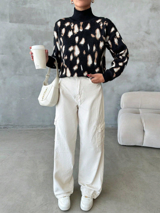 Kadın Leopar Desenli Yarım Balıkçı Yaka Triko Kazak TR241224
